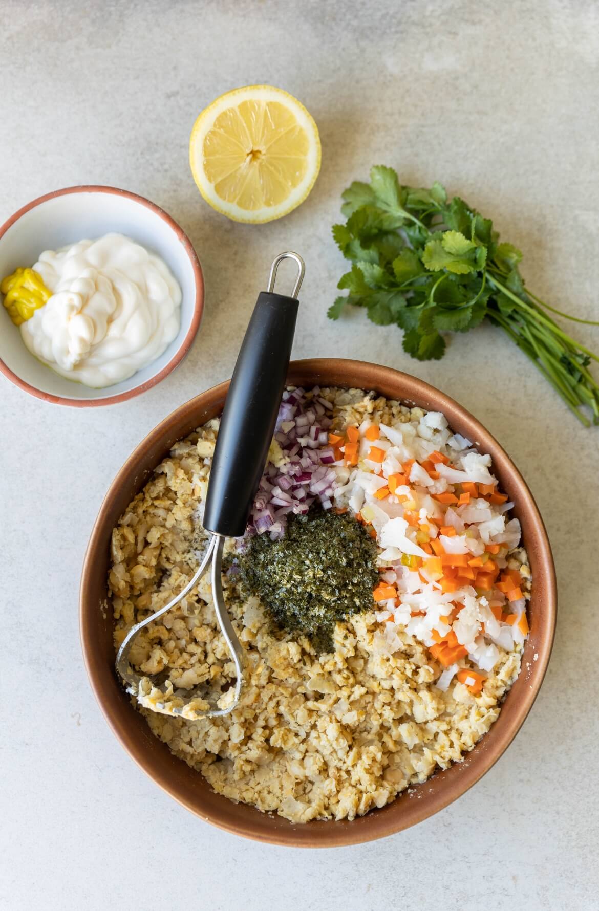 2. Esmagar o grão-de-bico com um garfo e envolver com os ingredientes picados